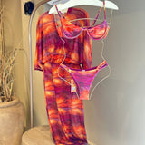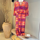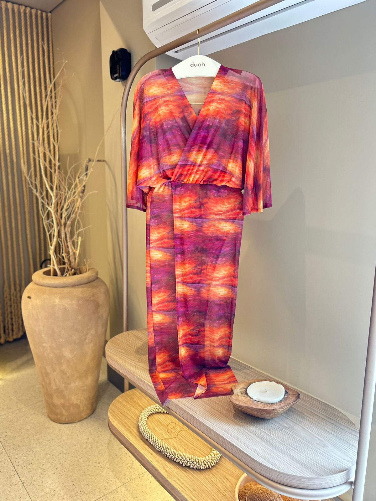 Saída vestido tem uma modelagem transpassada e mangas amplas.