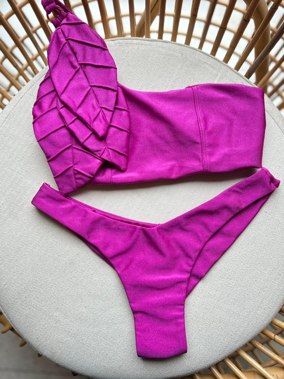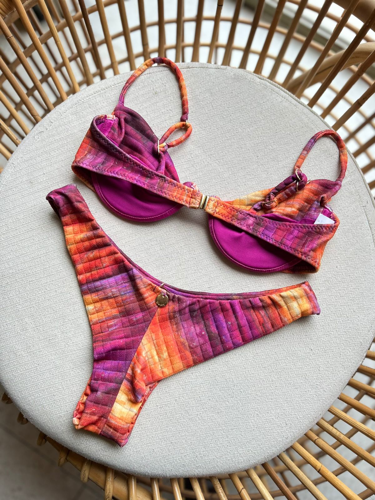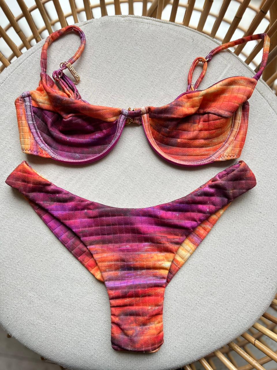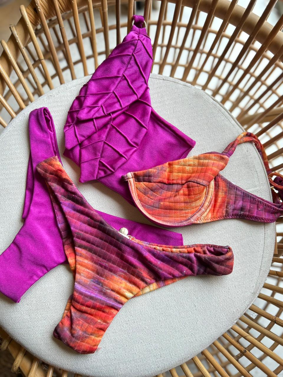 Dois biquínis completos: um pink sofisticado e um estampado em tons quentes com aro e ótima sustentação. Modelagens que valorizam o corpo e garantem versatilidade para arrasar na praia ou piscina.