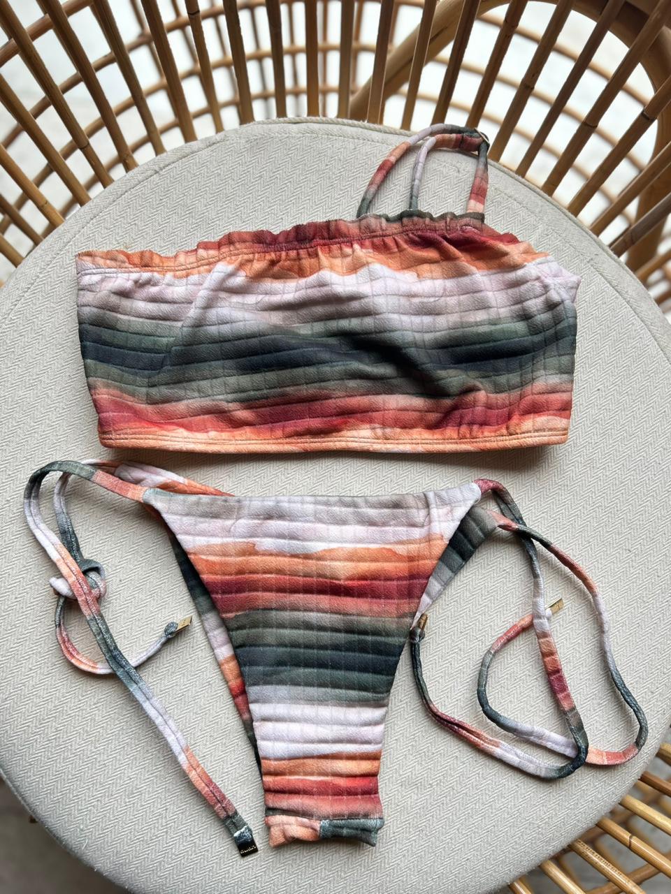 Dois biquínis completos: um verde elegante e outro estampado em tons terrosos com amarração ajustável. Modelagens que valorizam o corpo e garantem versatilidade para a praia ou piscina.