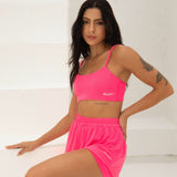 O Top possui alças finas e elástico na parte interna que reforçam a segurança, e seu cós com elástico embutido garante a sustentação de uma peça sempre no lugar.