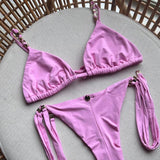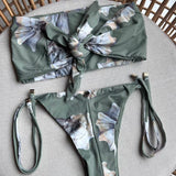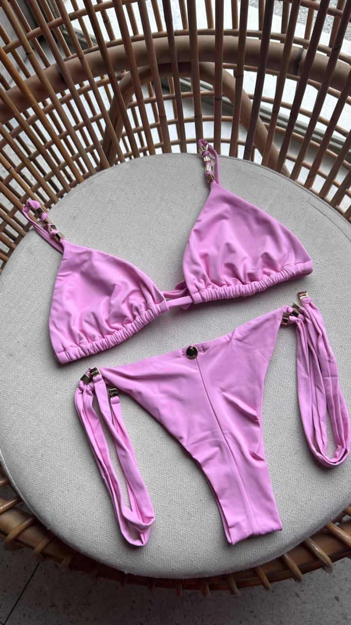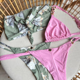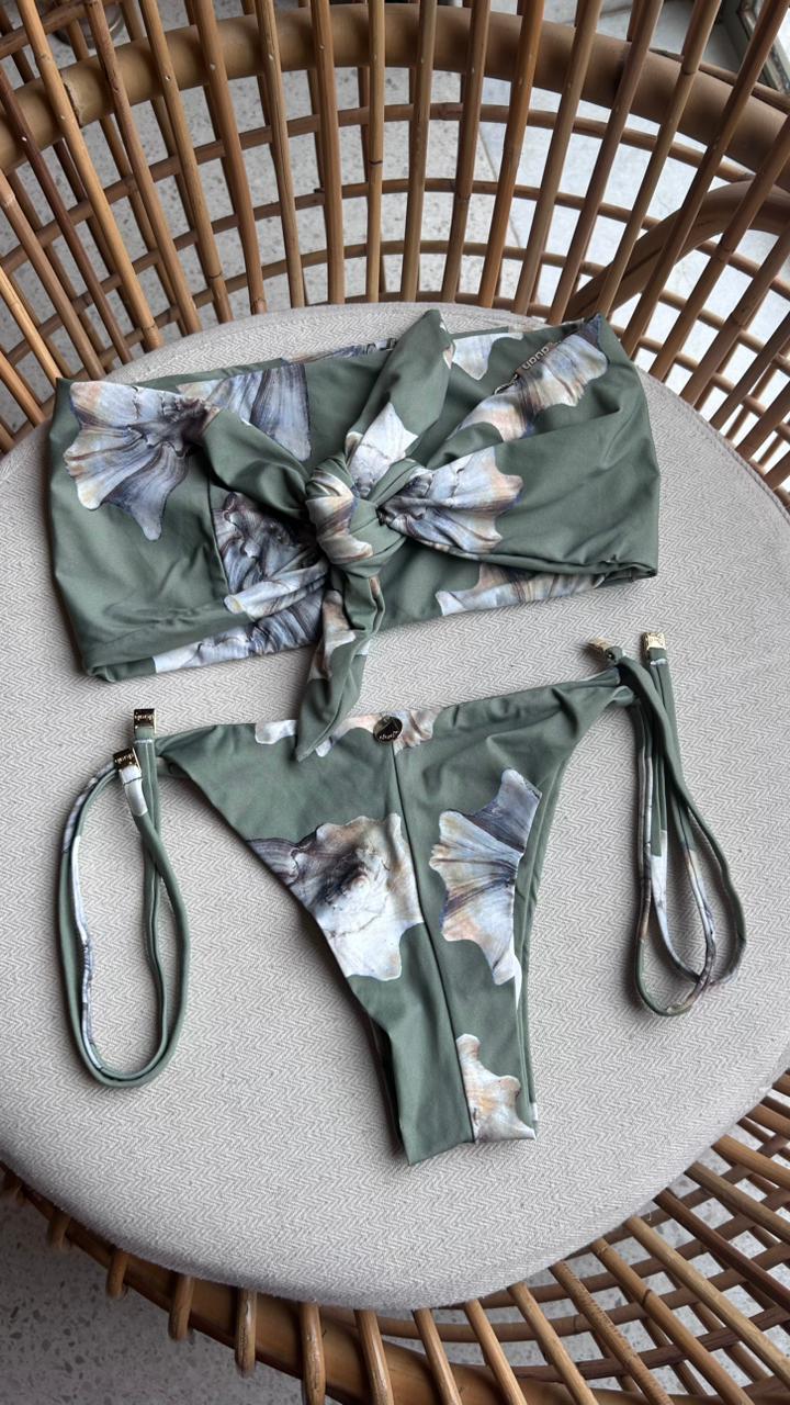 Combo com top faixa estampado com amarração frontal e biquíni cortininha com calcinha lisa. Peças em poliamida, com toque macio e excelente ajuste ao corpo.