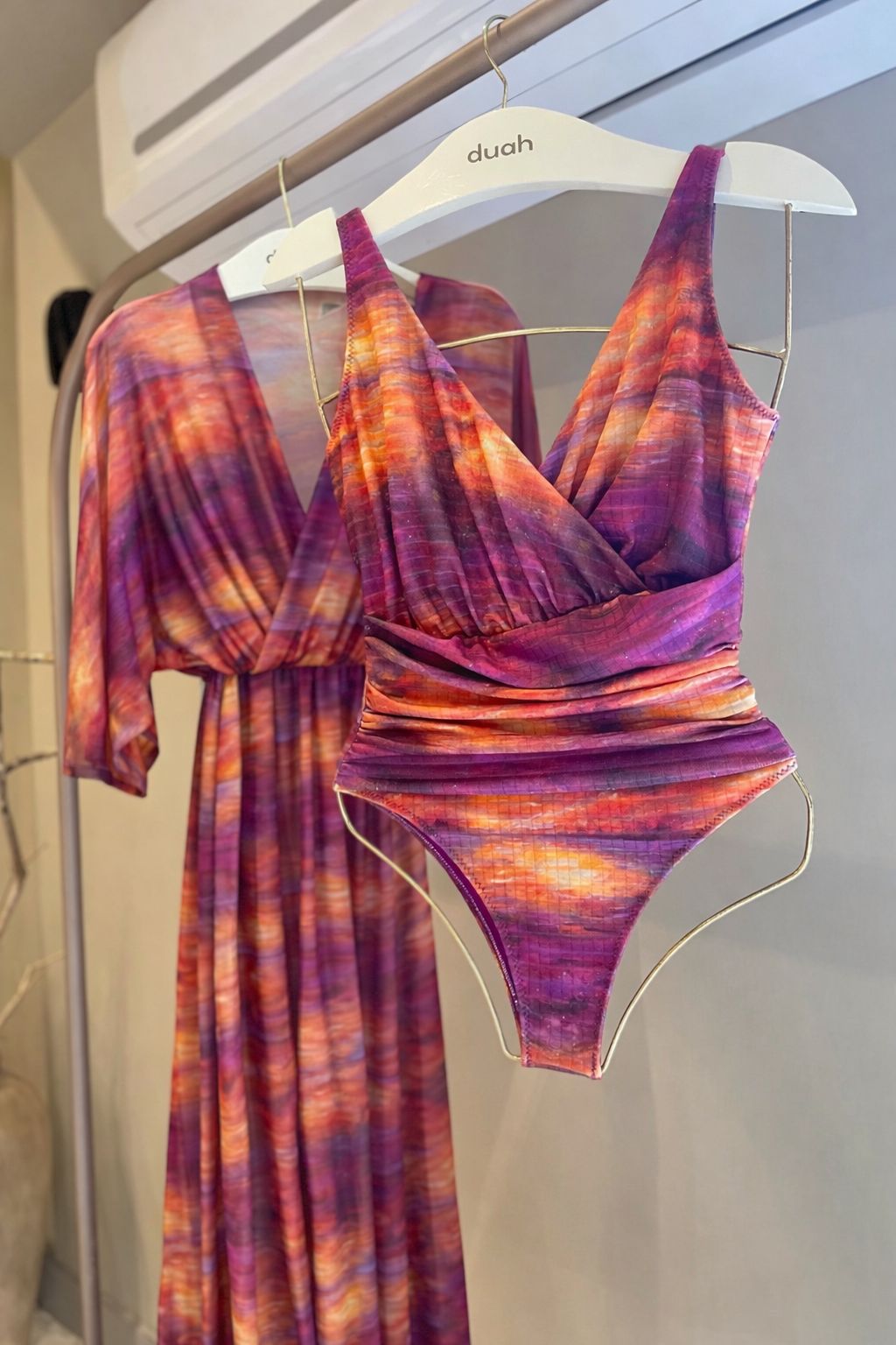 Saída vestido tem uma modelagem transpassada e mangas amplas.
