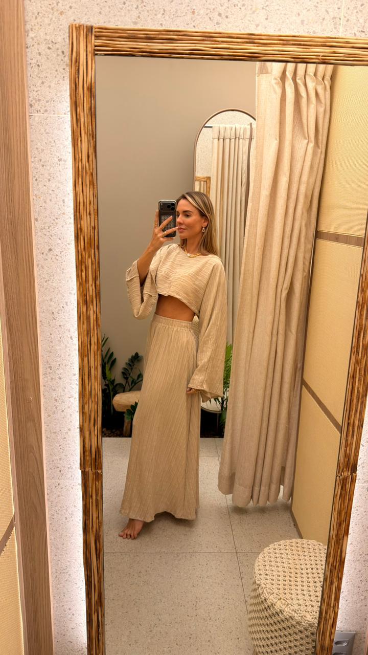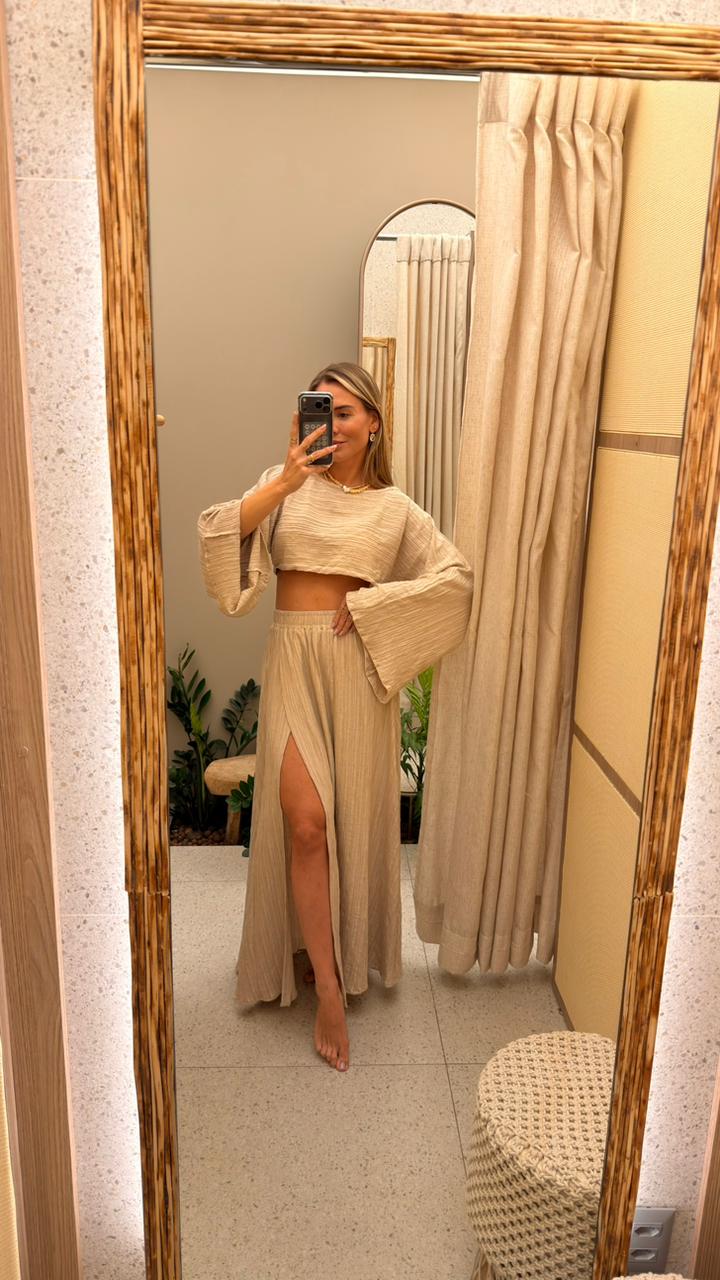 Conjunto Brisa — leve, elegante e naturalmente sofisticado. Feito em tecido texturizado, combina um cropped de mangas amplas com uma saia longa de fenda frontal que valoriza o movimento e alonga a silhueta. Confortável, fluido e versátil, é o look perfeito para quem busca charme, frescor e estilo em uma única peça.