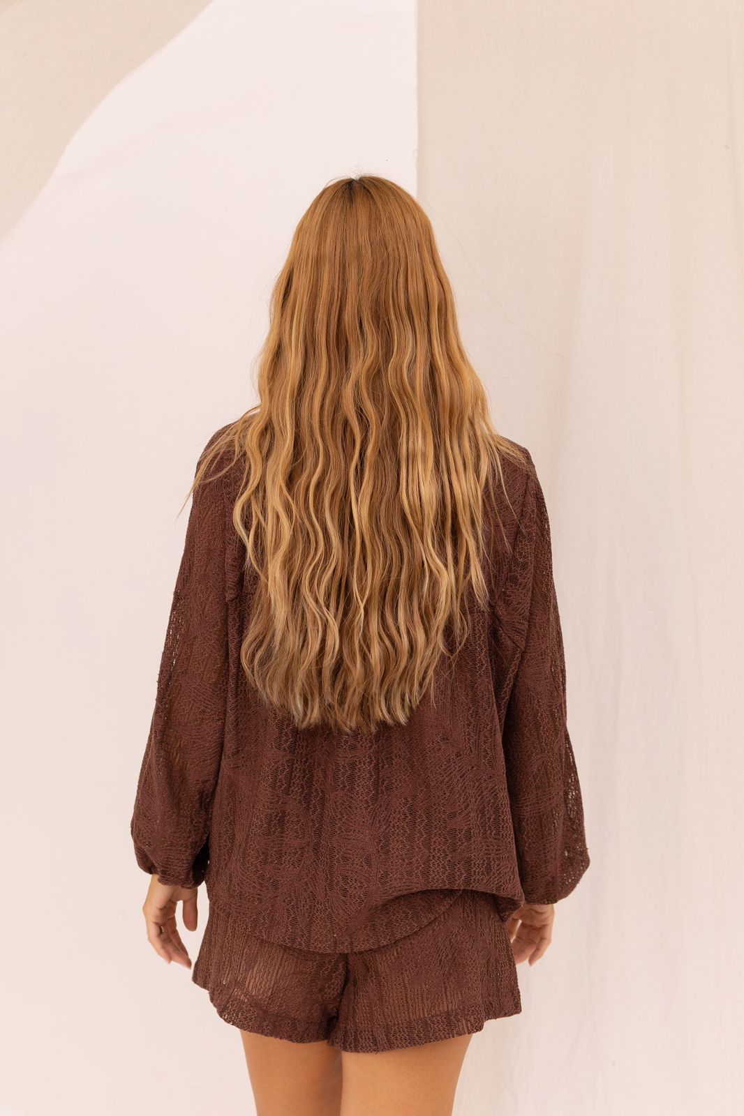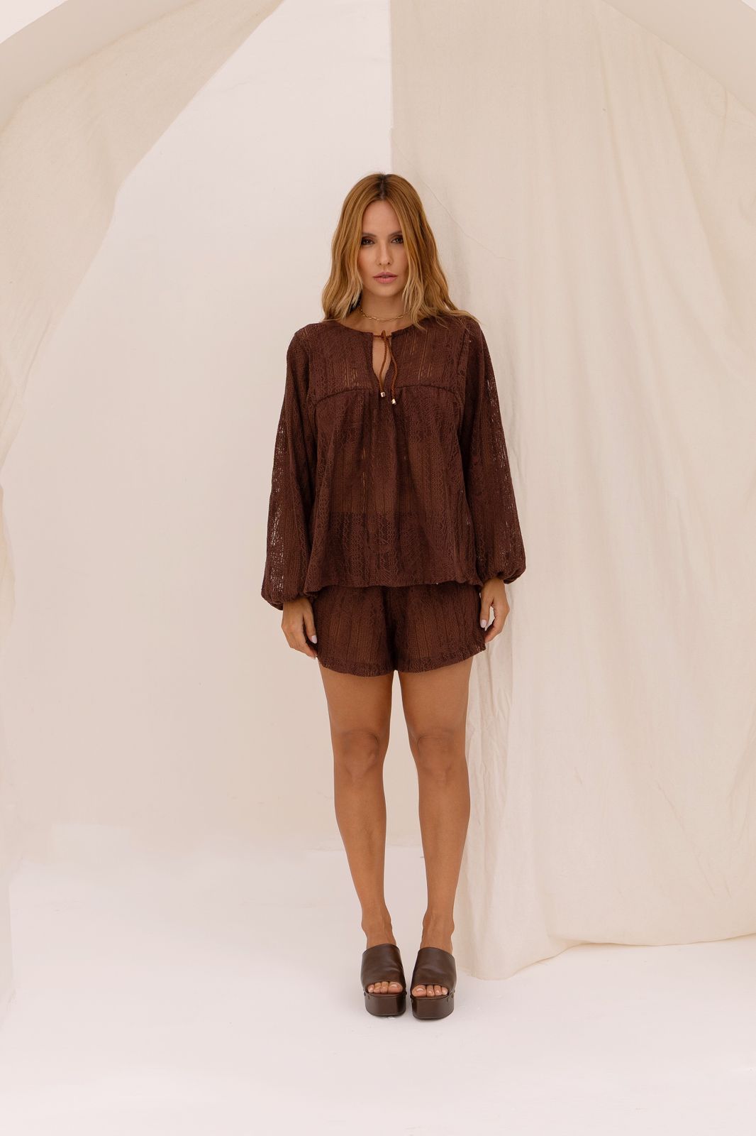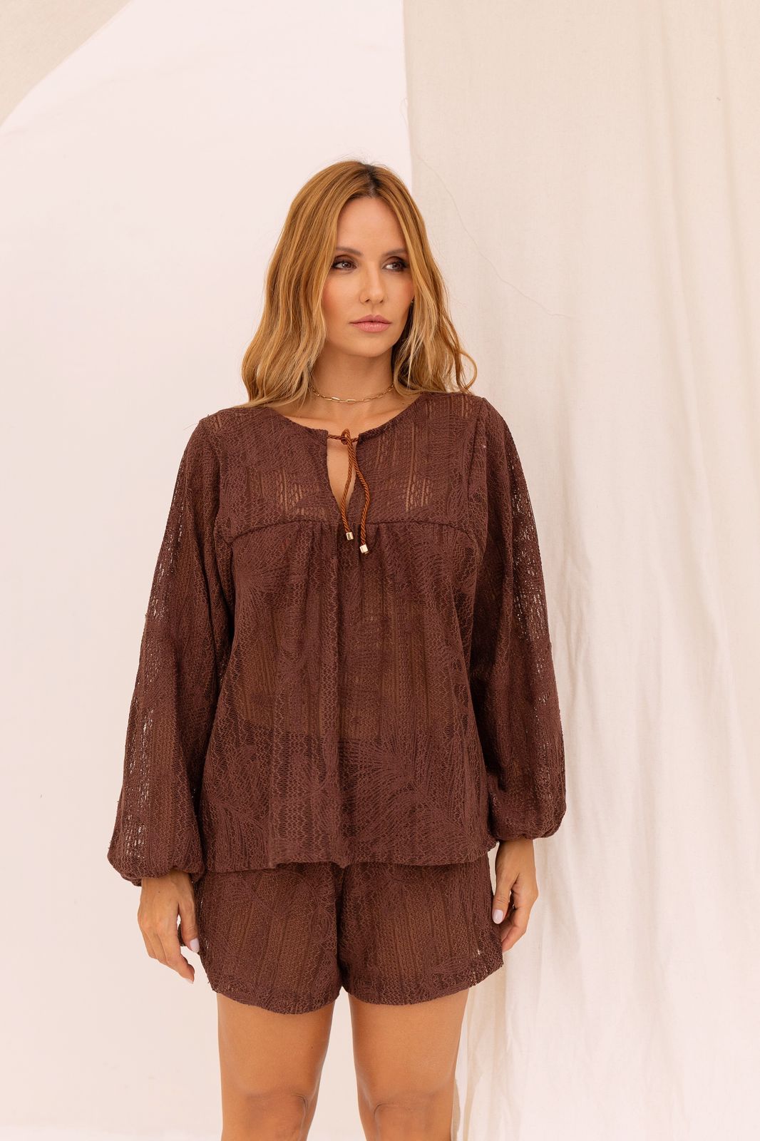 Conjunto confeccionado em renda exclusiva, com design leve e sofisticado. A bata possui modelagem oversized e detalhe de corda para amarrar no pescoço, garantindo um toque de estilo e elegância.