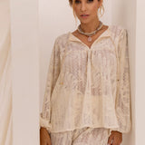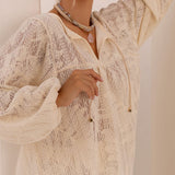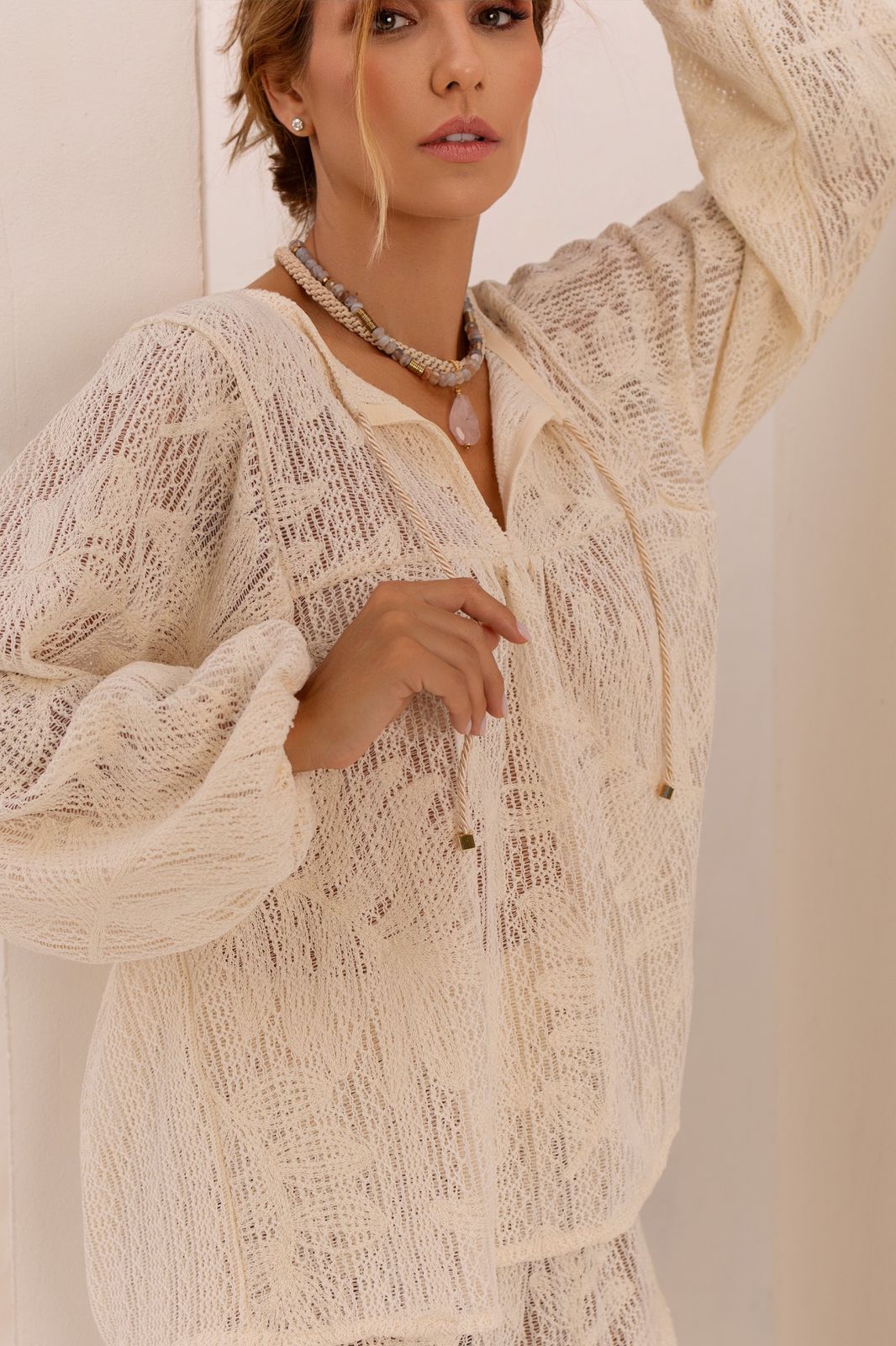 Conjunto confeccionado em renda exclusiva, com design leve e sofisticado. A bata possui modelagem oversized e detalhe de corda para amarrar no pescoço, garantindo um toque de estilo e elegância.