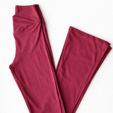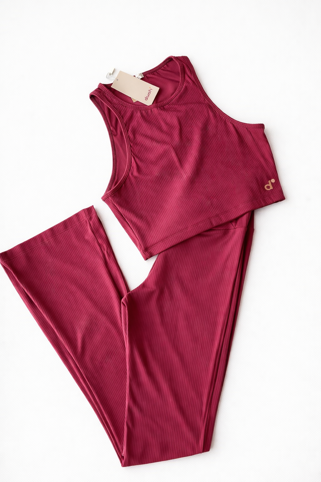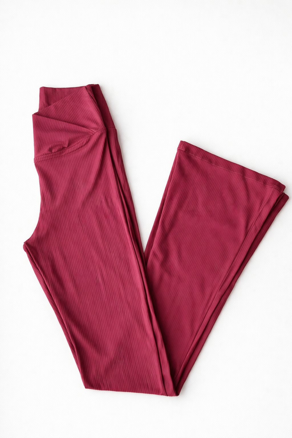 Conjunto fitness em poliamida canelada na cor rosa, com top de alta sustentação e calça flare de cós cruzado que valoriza a silhueta. Confortável, elegante e perfeito para treinos ou looks athleisure no dia a dia.